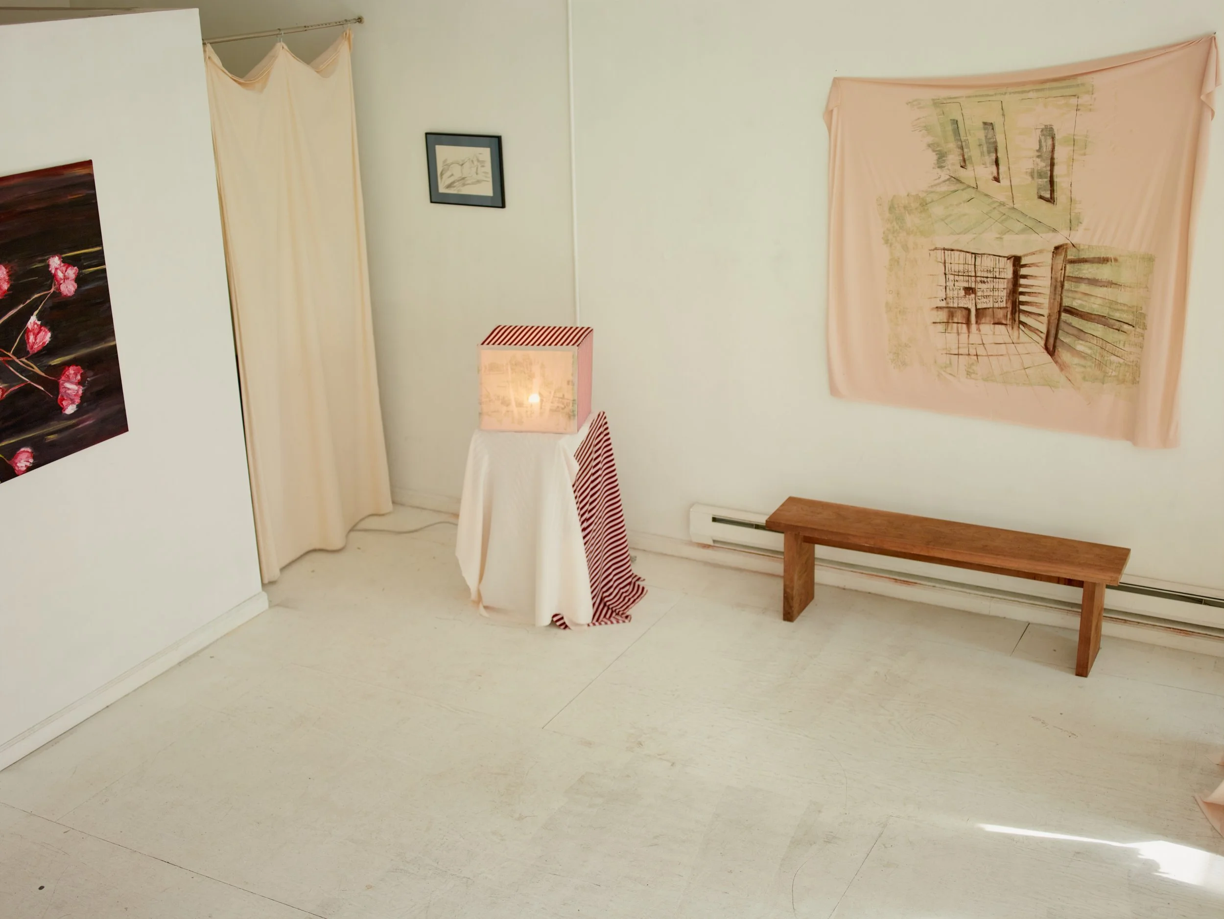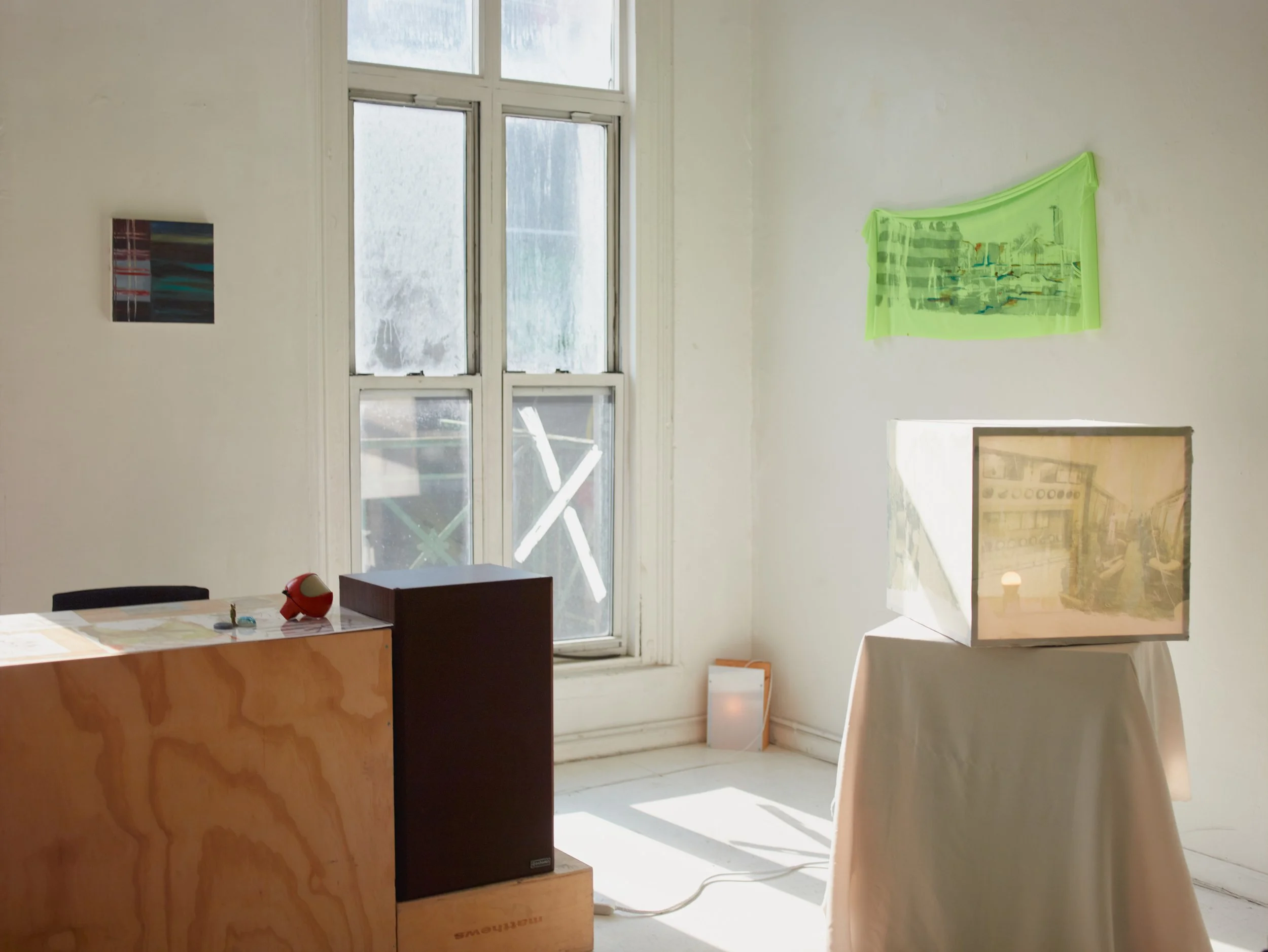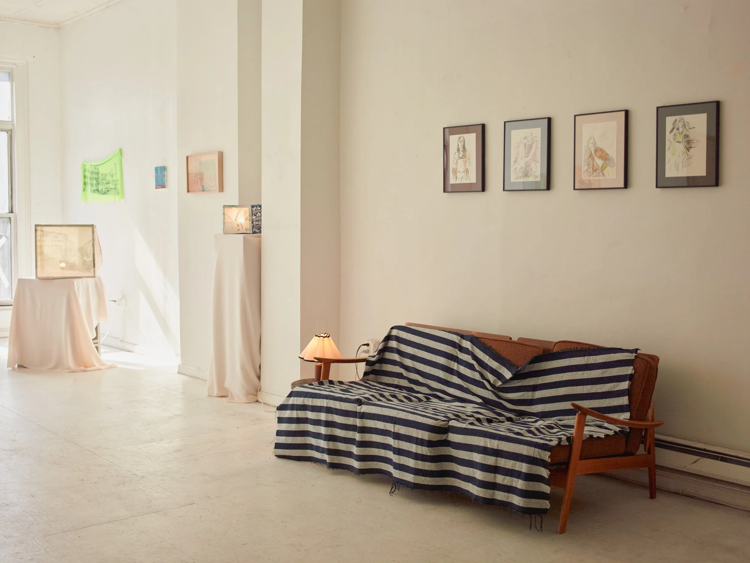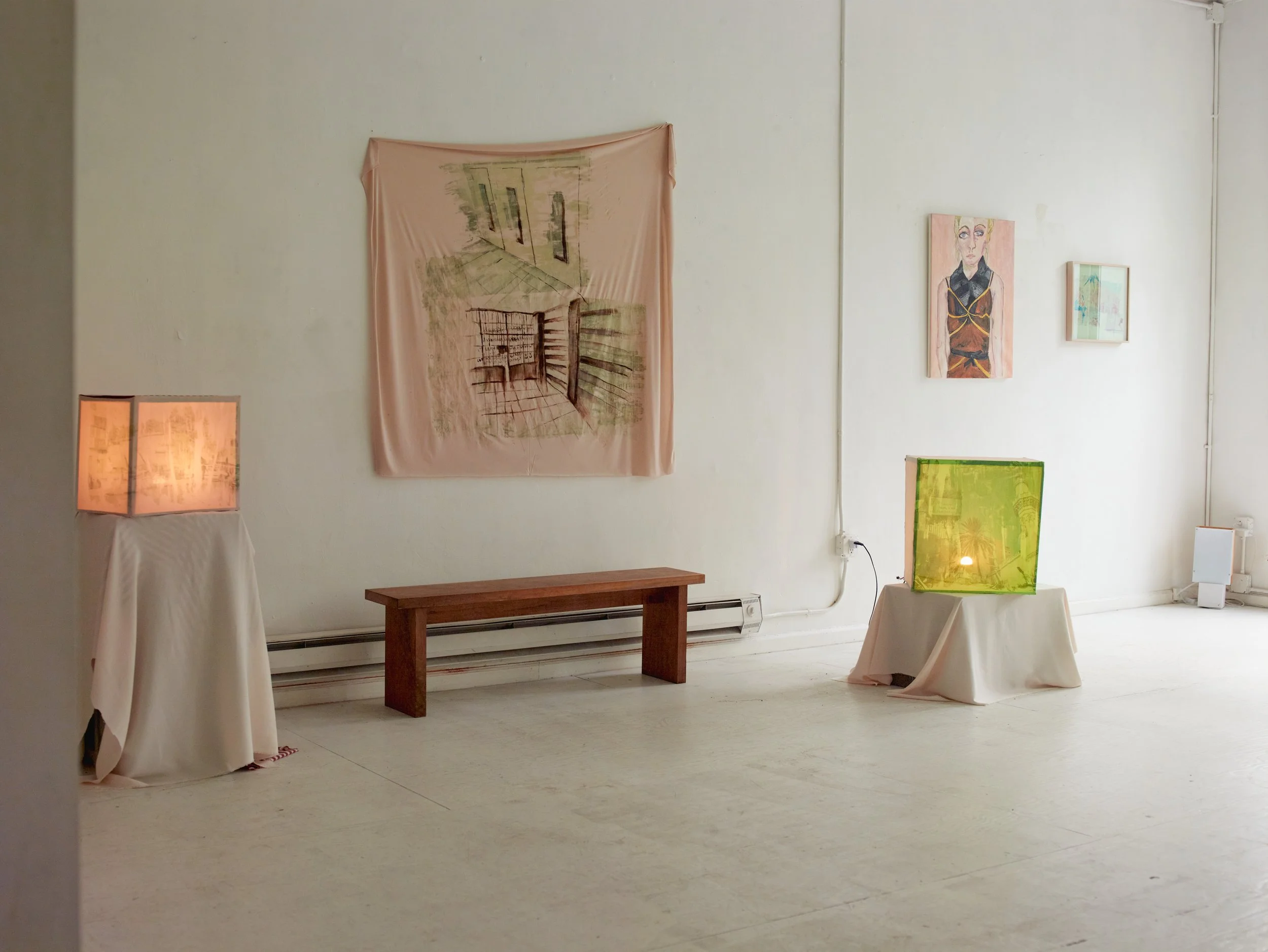 In Misr ﻣﺼﺮ, curator Sarah Daoui and Dabbous reconstruct the artist’s Cairo studio within a New York loft. Postcards, curtains, car covers, lights, and studio remnants are installed alongside finished textile works and light boxes. A soundscape by Jade Croo, composed from recordings gathered in and around Dabbous’s studio, further situates the work within its originating environment.