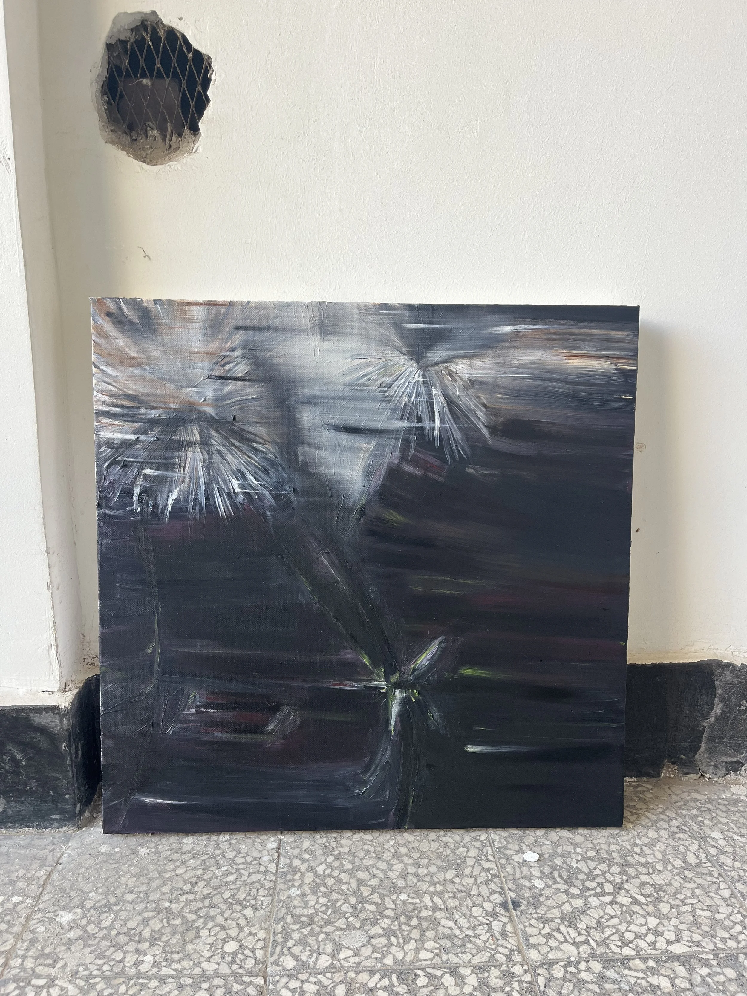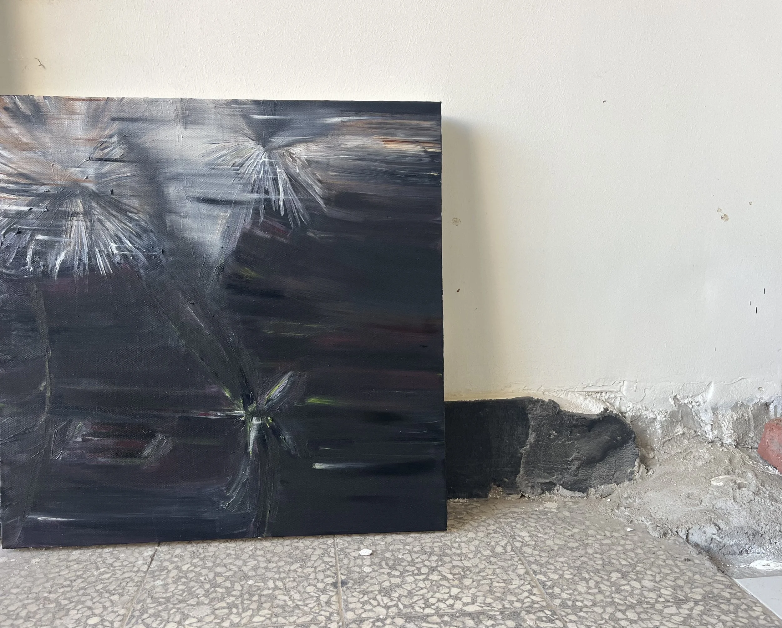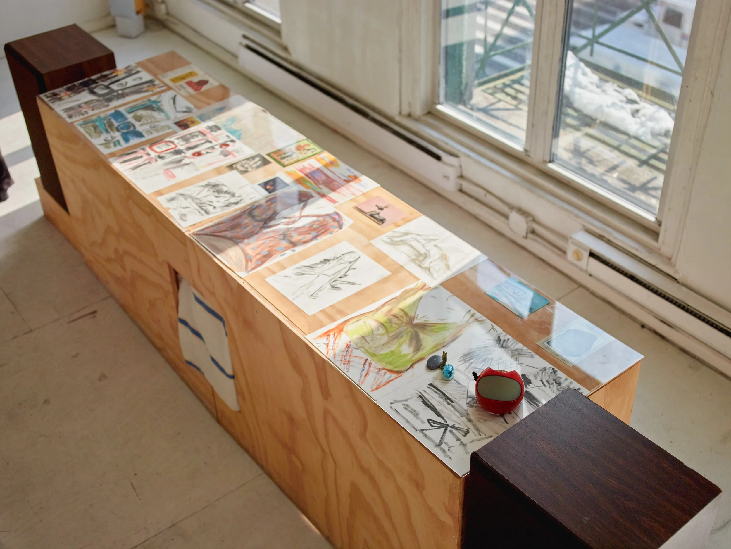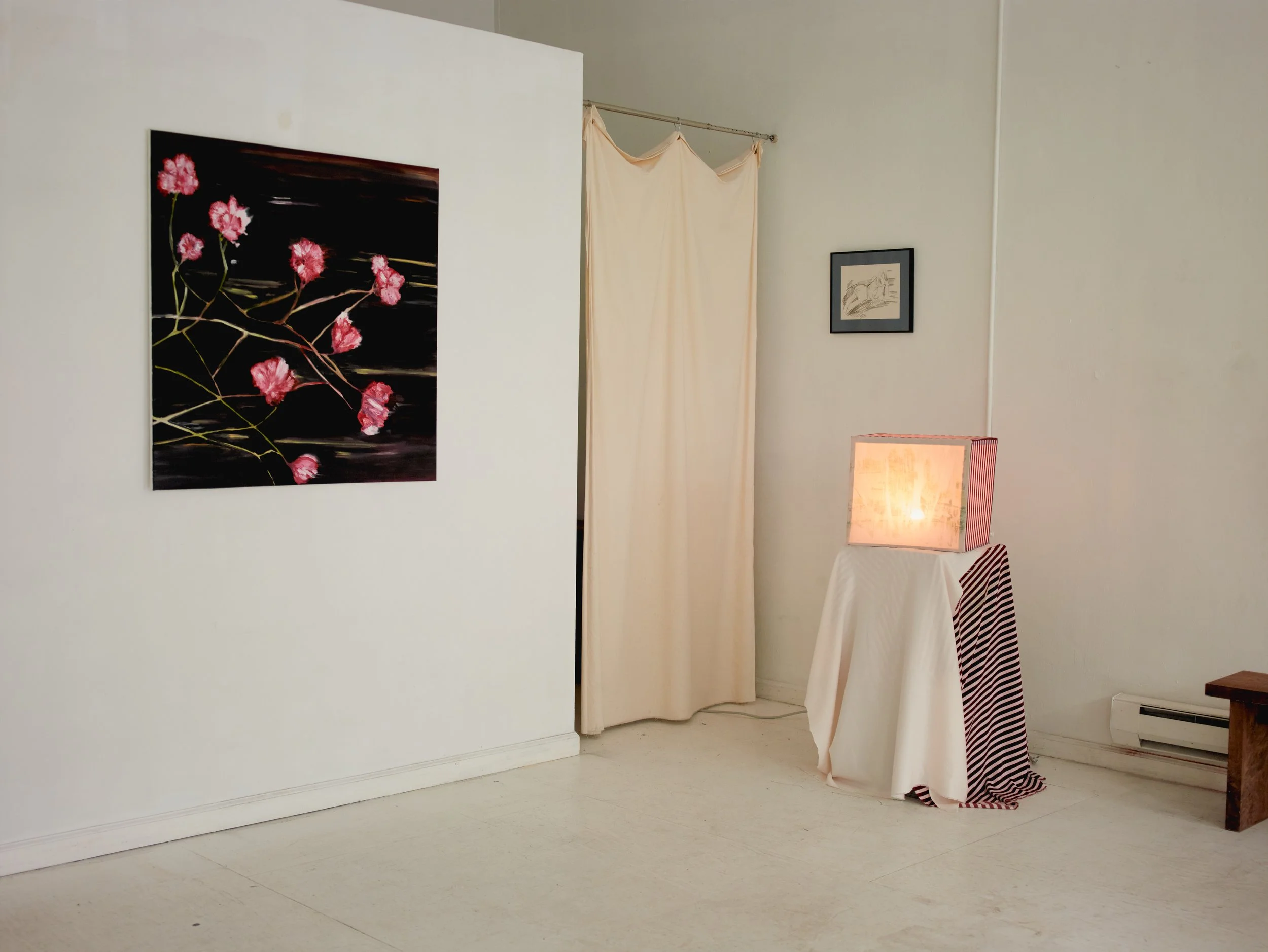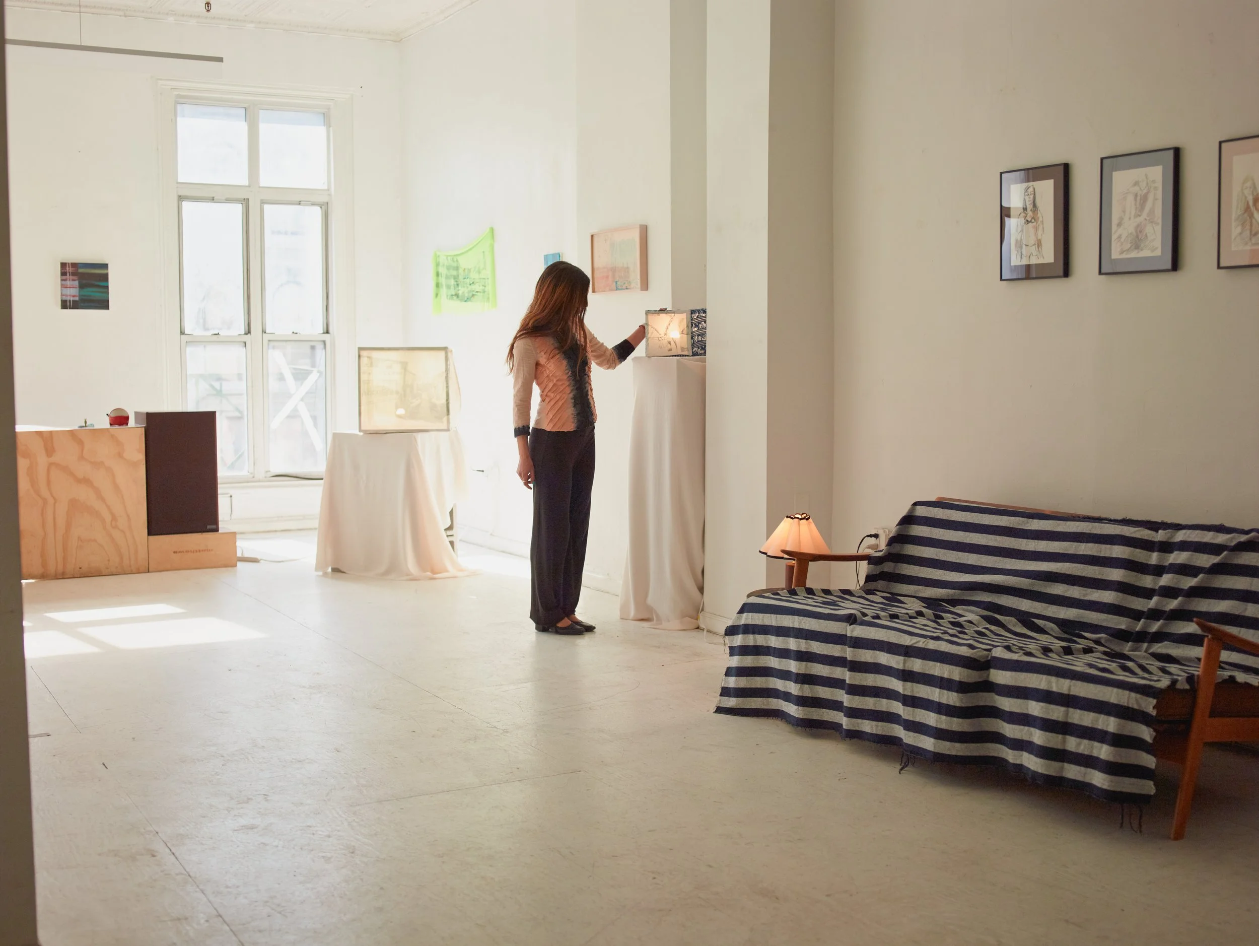 In Misr ﻣﺼﺮ, curator Sarah Daoui and Dabbous reconstruct the artist’s Cairo studio within a New York loft. Postcards, curtains, car covers, lights, and studio remnants are installed alongside finished textile works and light boxes. A soundscape by Jade Croo, composed from recordings gathered in and around Dabbous’s studio, further situates the work within its originating environment.